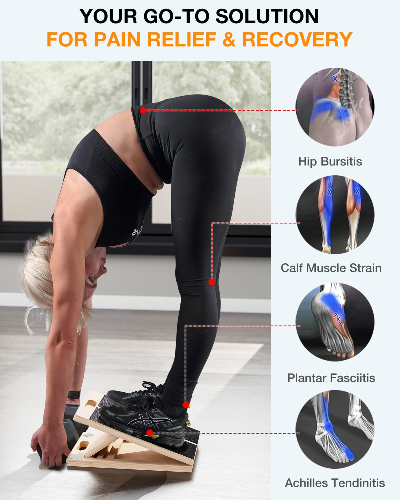 Full-body pain relief solution using slant board. Targets specific conditions including Hip Bursitis, Achilles Tendinitis, Calf Muscle Strain, and Plantar Fasciitis via acupressure and magnetic therapy.
