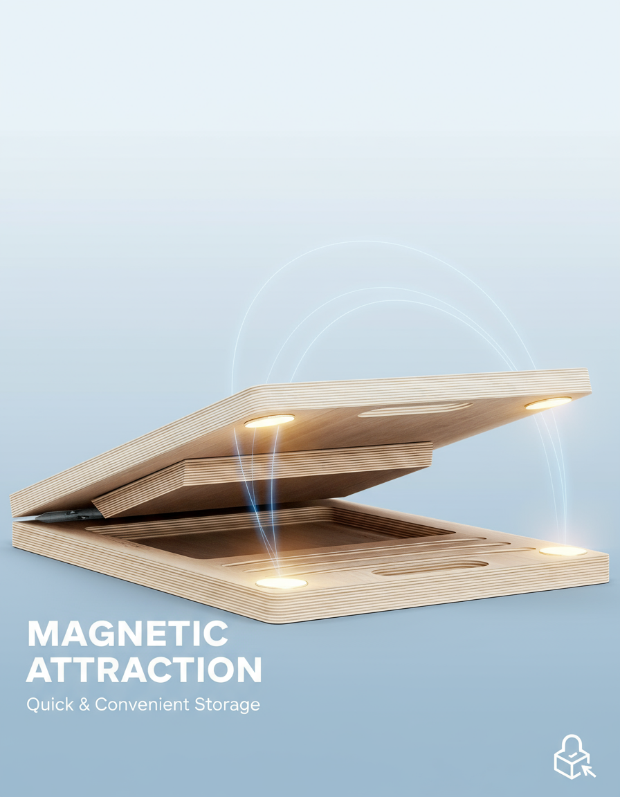 Portable wooden slant board features diagram showing magnetic closure handles and included recovery accessories