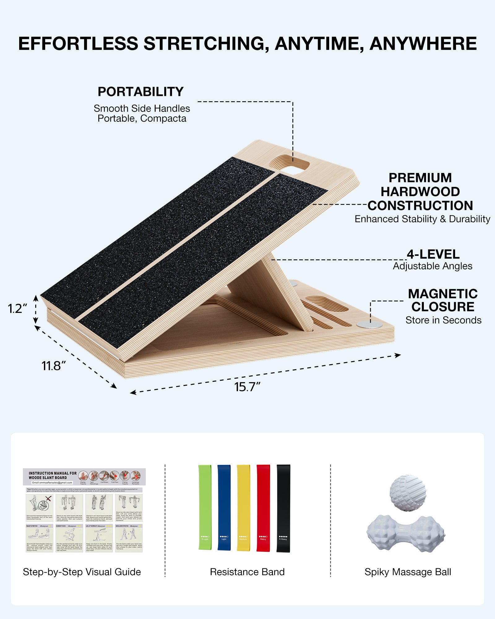 Heavy-duty wooden slant board supporting up to 500 lbs. Features 4 adjustable incline levels (20°, 25°, 35°, 45°) for customized calf stretching and flexibility goals.