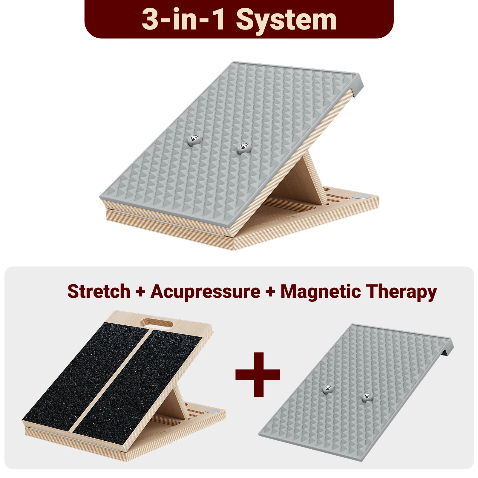 3-in-1 wooden slant board system combining stretching acupressure and magnetic therapy